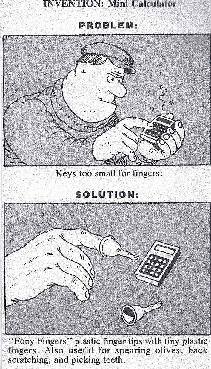 S'il n'y avait que la grosseur des doigts comme problème, la solution proposée par Al Jaffee dans son livre intitulé "Al Jaffee's MAD Inventions" publié en 1978 pourrait s'appliquer. Cependant, il y a aussi le problème de rendre le contenu lisible car le patrimoine écran sur lequel on doit afficher le contenu est réellement restreint. Comme il est décrit dans Quicktools.com à sa section "screenfly", ces écrans vont de 176x270 pour un Motorola RACQ V3M à 414x736 pour un Apple iPhone 6+ en passant par 320x640 pour un Samsung Galaxy S4. Je note aussi que les mobiles s'utilisent surtout en mode "portrait".