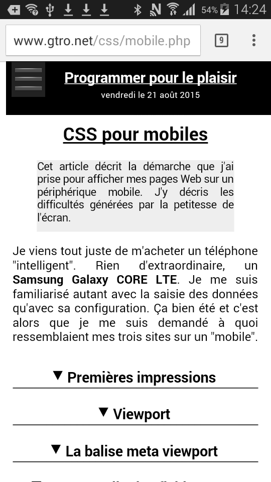 Cet article décrit la démarche que j'ai prise pour afficher mes pages Web sur un périphérique mobile. J'y décris les difficultés générées par la petitesse de l'écran.