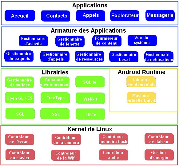 En fait, Android, un logiciel libre, est une pile de composants logiciels en couches entourant un noyeau Linux (c'est une version conçue spécialement pour l'environnement mobile, avec une gestion avancée de la batterie et une gestion particulière de la mémoire) qui offre un niveau d'abstraction entre le logiciel et le matériel (pilotes pour périphériques ainsi que capacités de résautage). En fait, le noyau est l'élément du système d'exploitation qui permet de faire le pont entre le matériel et le logiciel.